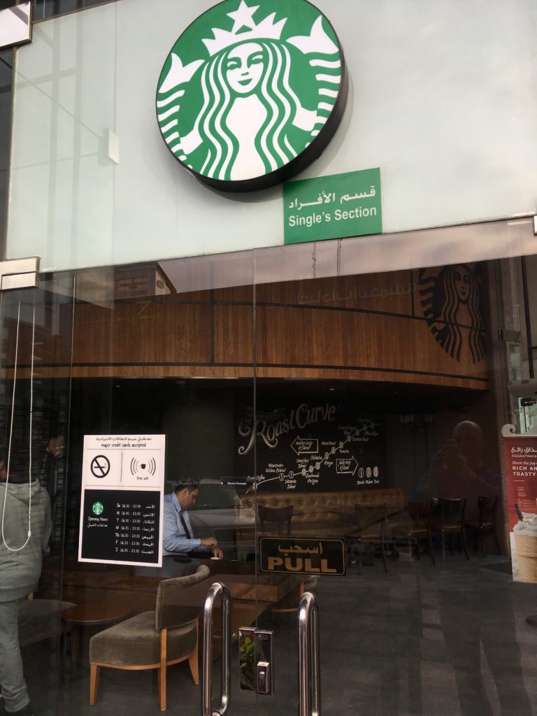 Next morning, I was up early to get some Starbucks. Store was divided right down the middle with two separate entrances, although the employees worked behind the same counter. The dividing was was just a foot short of ceiling high, and ran all the way up to the counter. Way to rub it in Saudi Arabia, making me sit in the “Single’s Section”