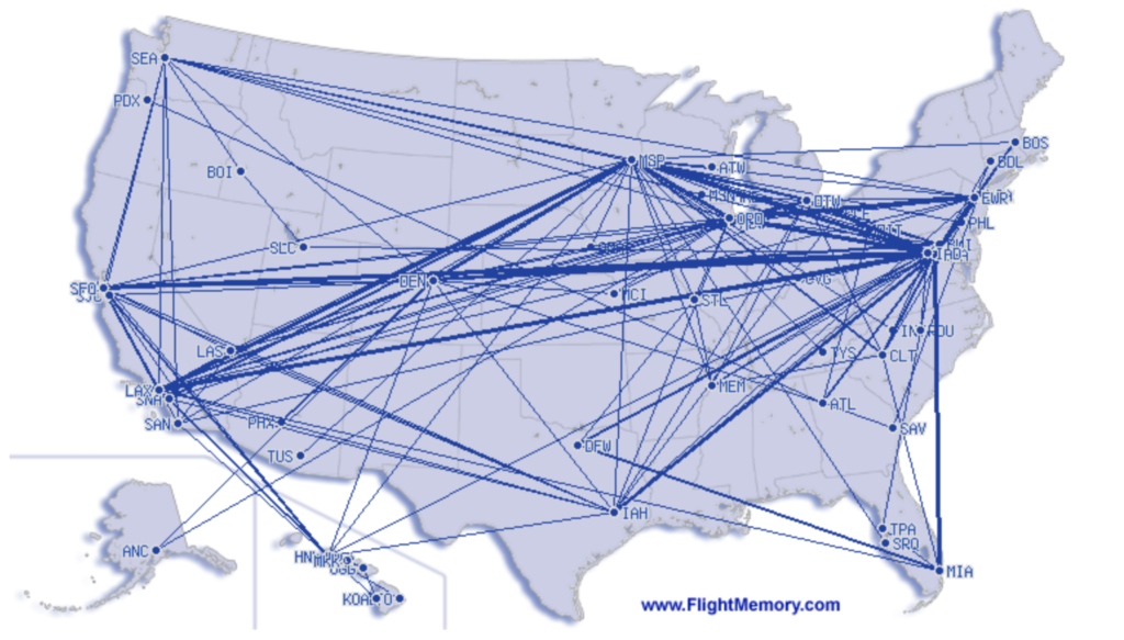 First flight was in 1972, and since then I’ve flown way too many routes to list here. Some of the things which surprise me most are the relative lack of flights that cross the south or the northwest part of the country. Maybe I’ll have to work on adding new lines to this. Also, surprised the sheer number of different cities I’ve flown to/from Hawaii!