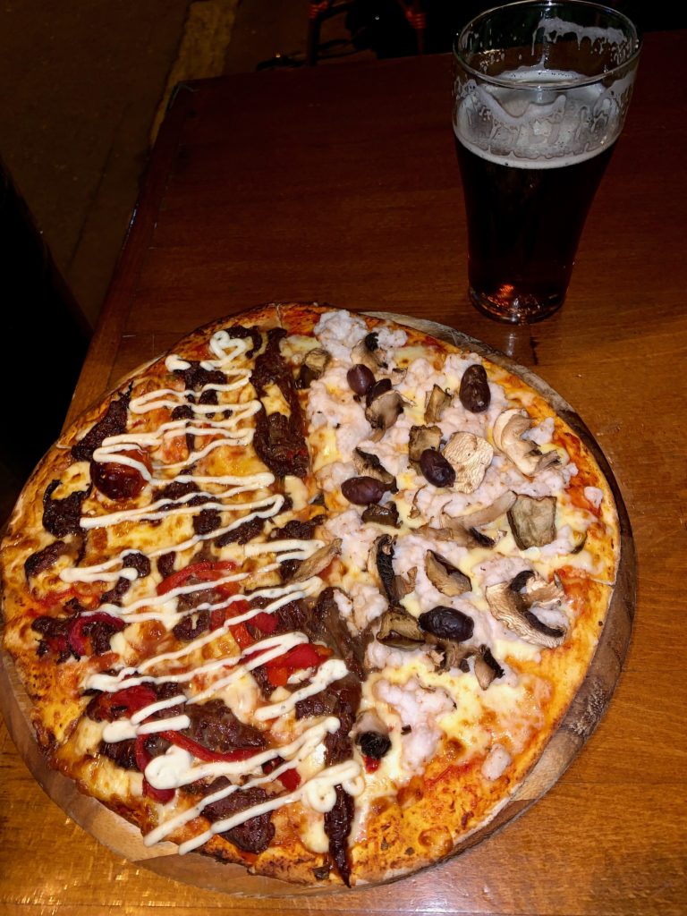 Inside, I was shocked at how popular the place was! It wasn’t huge, but every seat was taken and a few dozen people were standing around too. For a town of under 20,000, it seemed the whole town was here. First, a very nice beer or two to warm up…