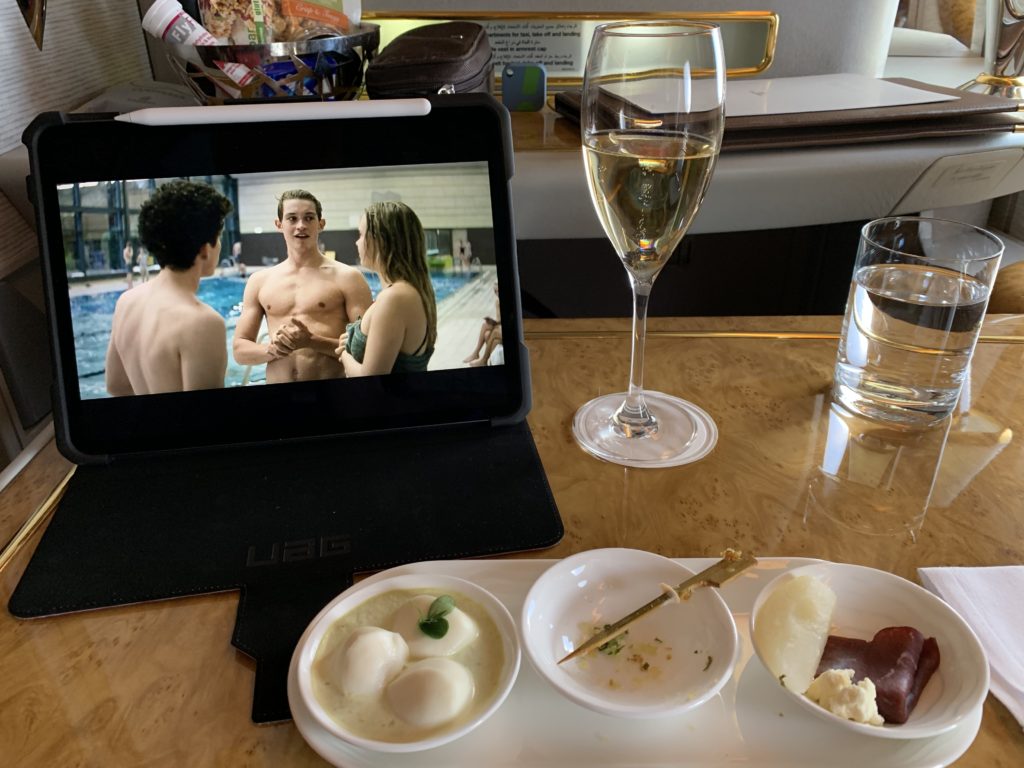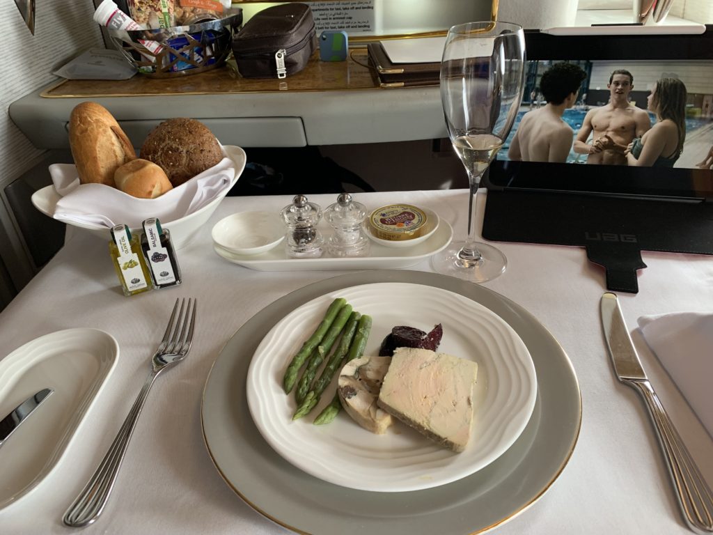 I asked what would be good for a small starter along with more champagne after takeoff, and the crew recommended the scallops as they were nice and light. They were also absolutely delicious.